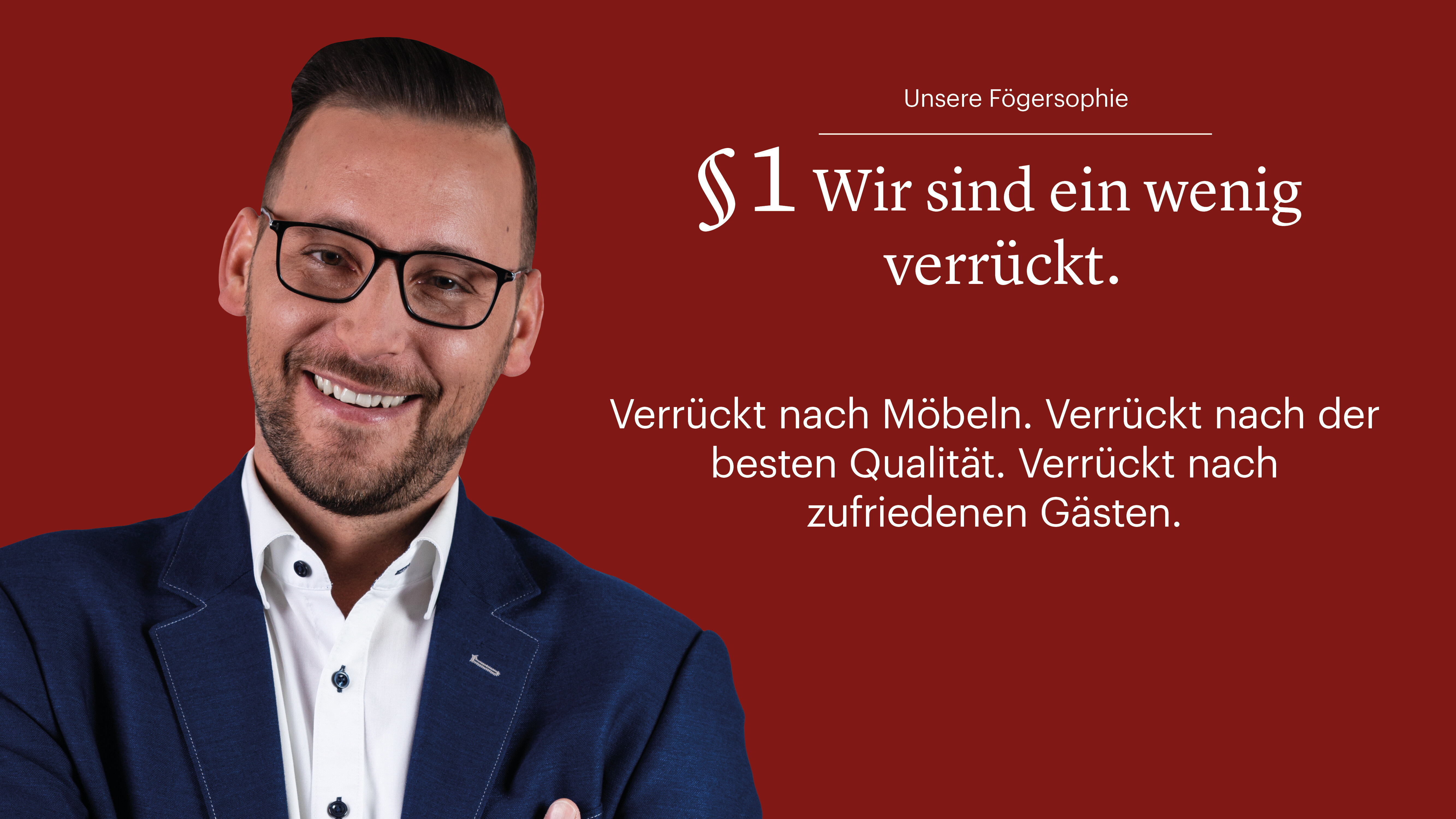 Unsere fögersopie, also die Grundwerte, die uns definieren, war schon immer klar: Wir müssen nicht das größte Sortiment haben, nur das richtige. Das haben wir unseren Kunden immer wieder bewiesen, indem wir mit atemberaubenden Möbeln, ausgefallenen Ideen, individueller Beratung und umfangreichem Service punkten. Bei Föger glauben wir daran, dass ein Gast nur dann wiederkommt, wenn er gut beraten wurde. Und nicht, wenn er möglichst billig kauft.