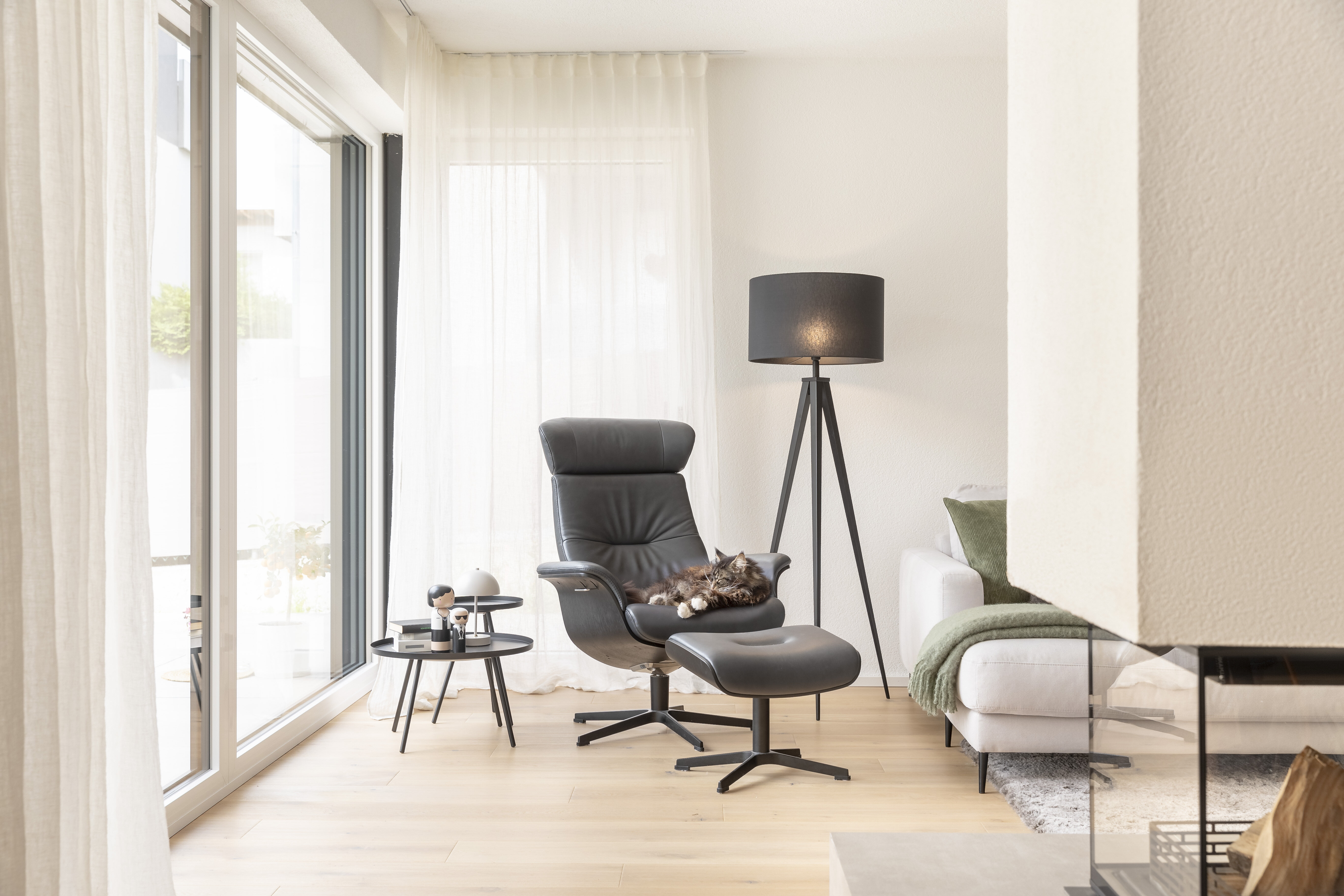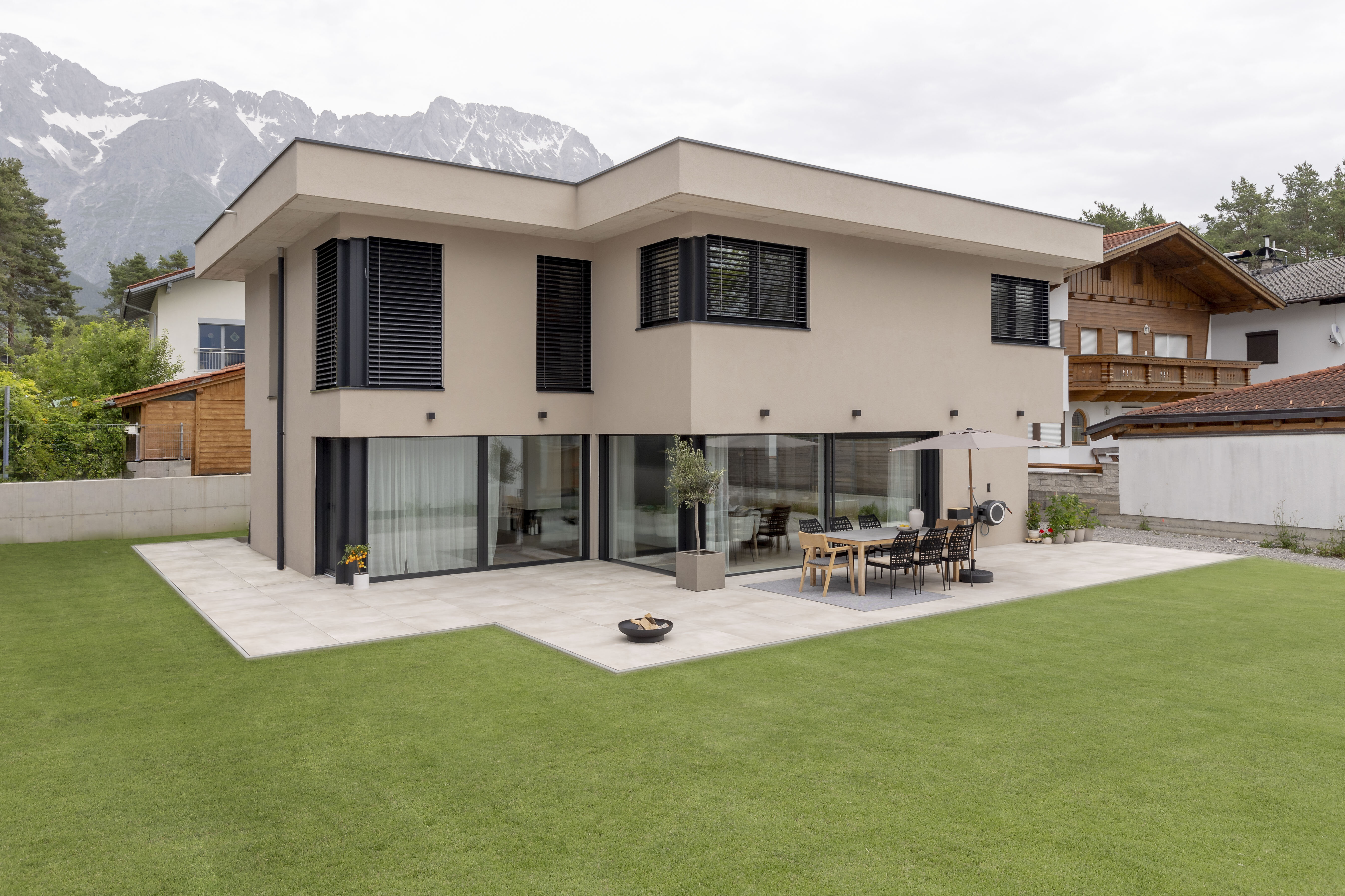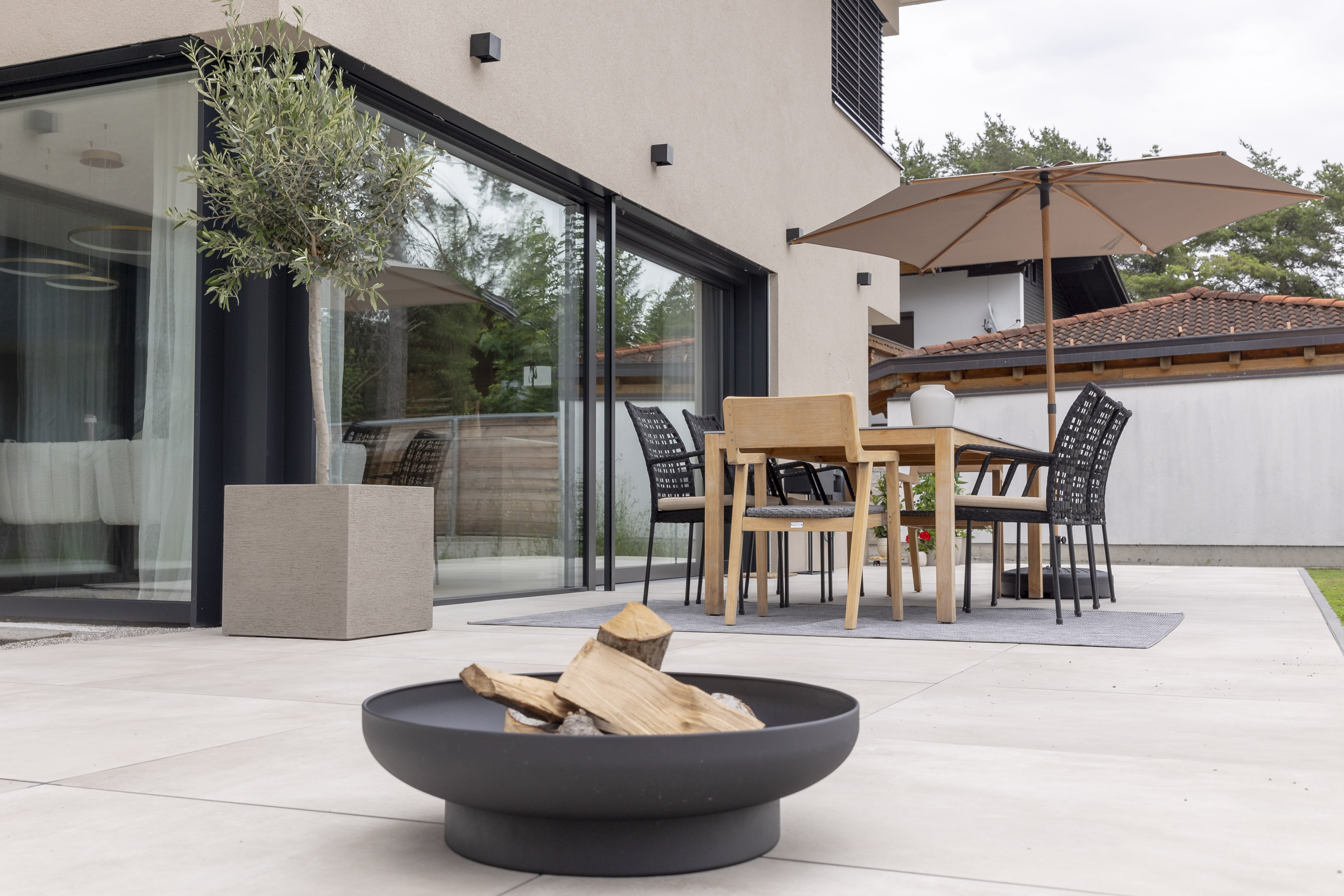 Die großzügige Terrasse, die direkt an die Panoramafenster anschließt, erweitert den Wohnraum ins Freie. Hier setzt die Familie auf hochwertige Outdoor-Möbel von Stern. Diese wetterfesten Loungemöbel vereinen Komfort und Stil und sind perfekt auf die moderne Ästhetik des Hauses abgestimmt. Der Garten ist nicht nur ein Rückzugsort, sondern eine stilvolle Erweiterung der Wohnräume – ideal für entspannte Stunden im Freien oder gesellige Abende mit Freunden und Familie.