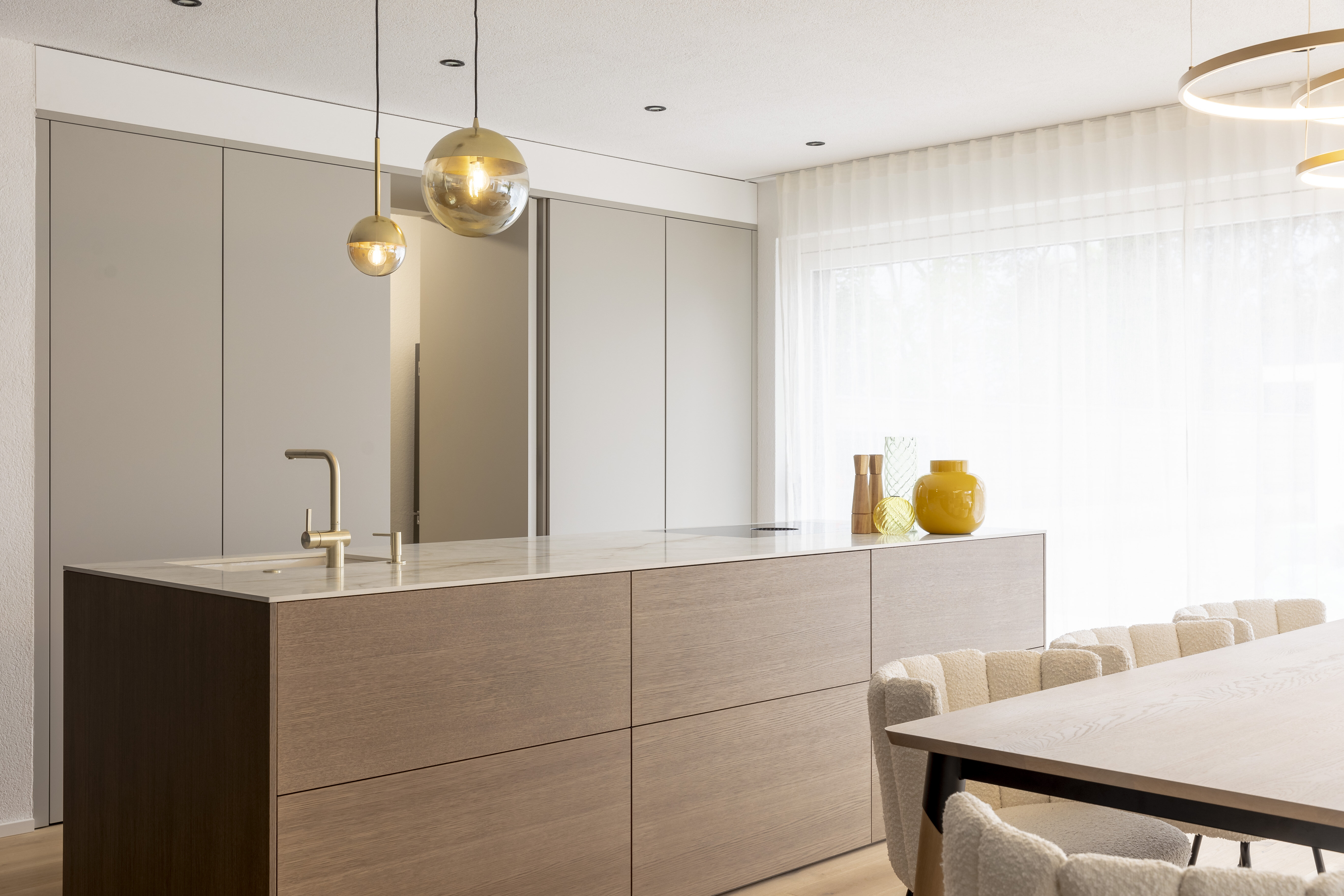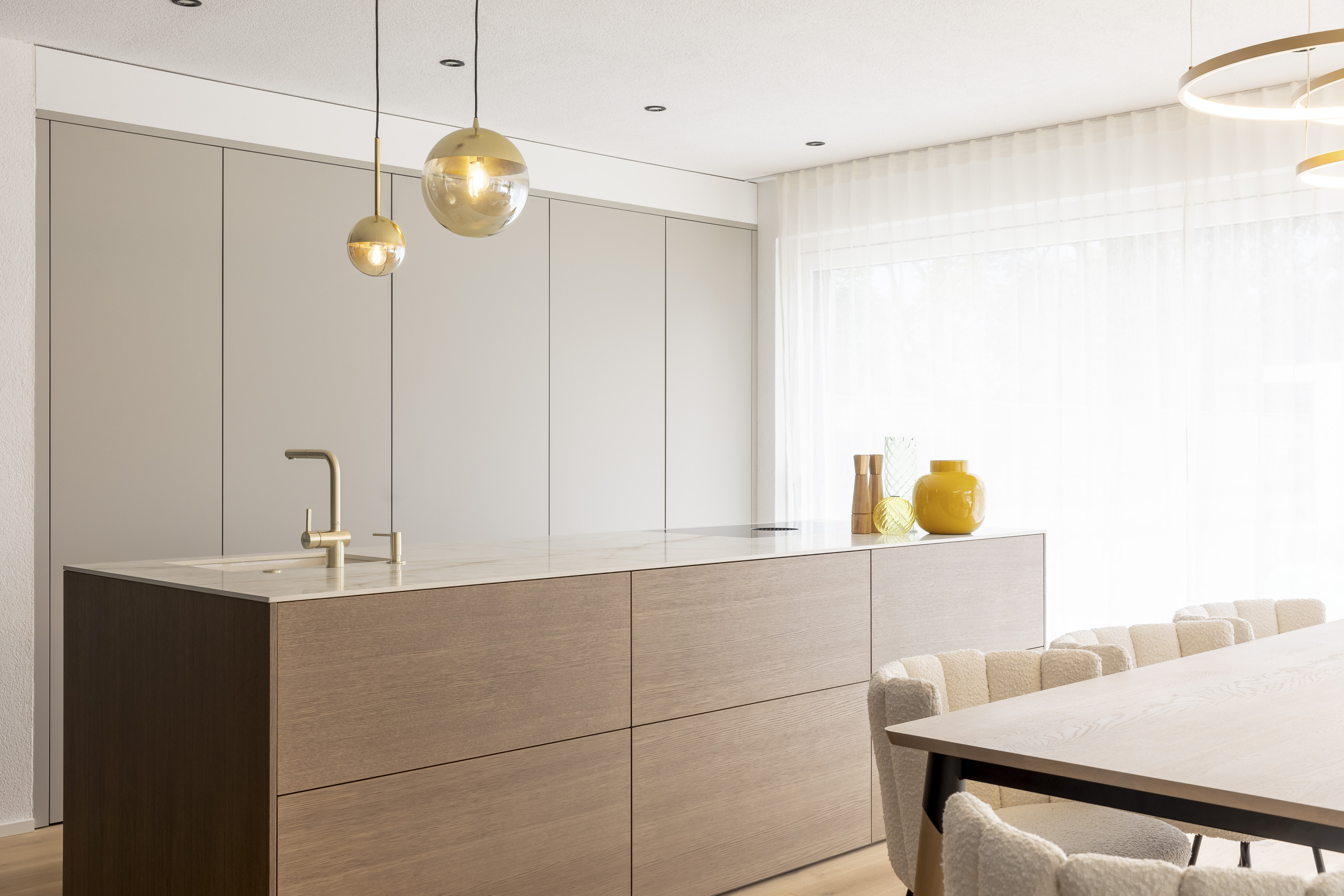 Ein weiteres Highlight des Hauses ist die offene Leicht-Küche, die modernes Design und Funktionalität vereint. Die Küche besticht durch eine große Eichenholzinsel, die als zentraler Treffpunkt für die Familie dient. Hier wird gekocht, geredet und gemeinsam Zeit verbracht. Die helle Keramikarbeitsplatte sorgt nicht nur für einen zeitlosen Look, sondern ist auch äußerst pflegeleicht und langlebig – ein echtes Plus für den Alltag einer Familie.