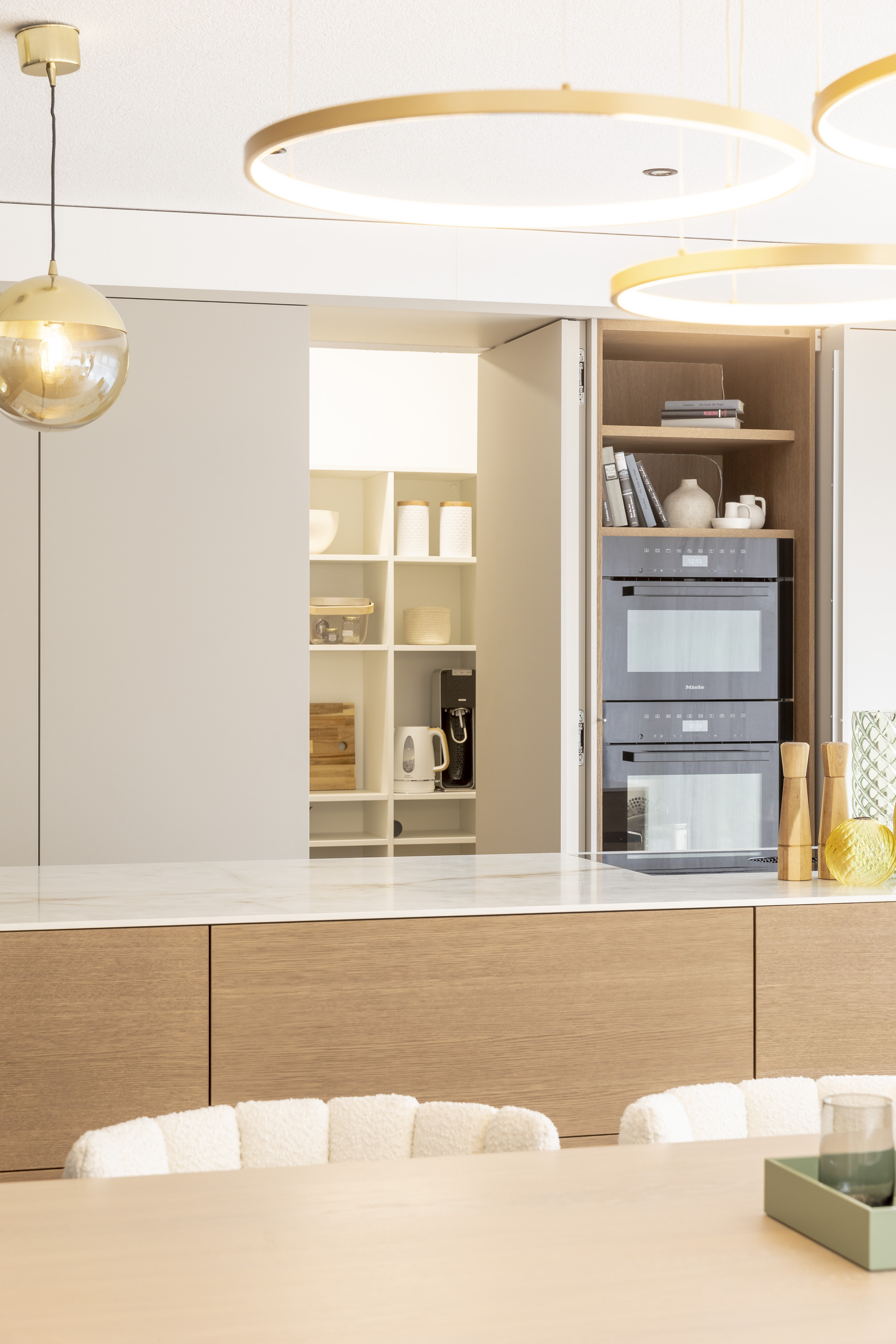 Besonders praktisch ist die versteckte Speisekammer, die sich elegant hinter der Küchenfront verbirgt. Hier findet alles Platz, was im Alltag schnell griffbereit sein muss, ohne den offenen Wohnbereich zu stören. Die Küche ist nicht nur ein optischer Hingucker, sondern überzeugt auch durch ihre durchdachte Funktionalität.