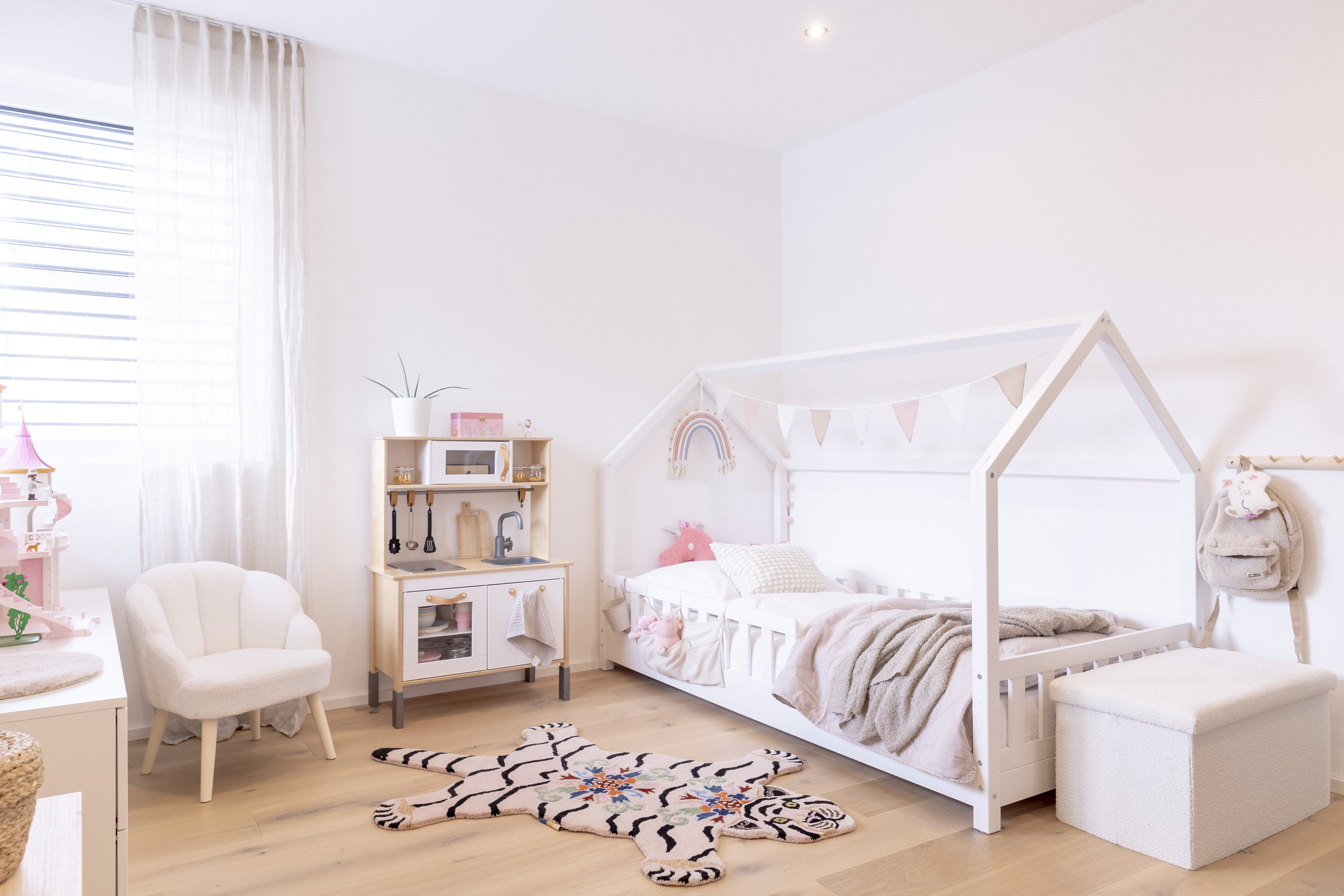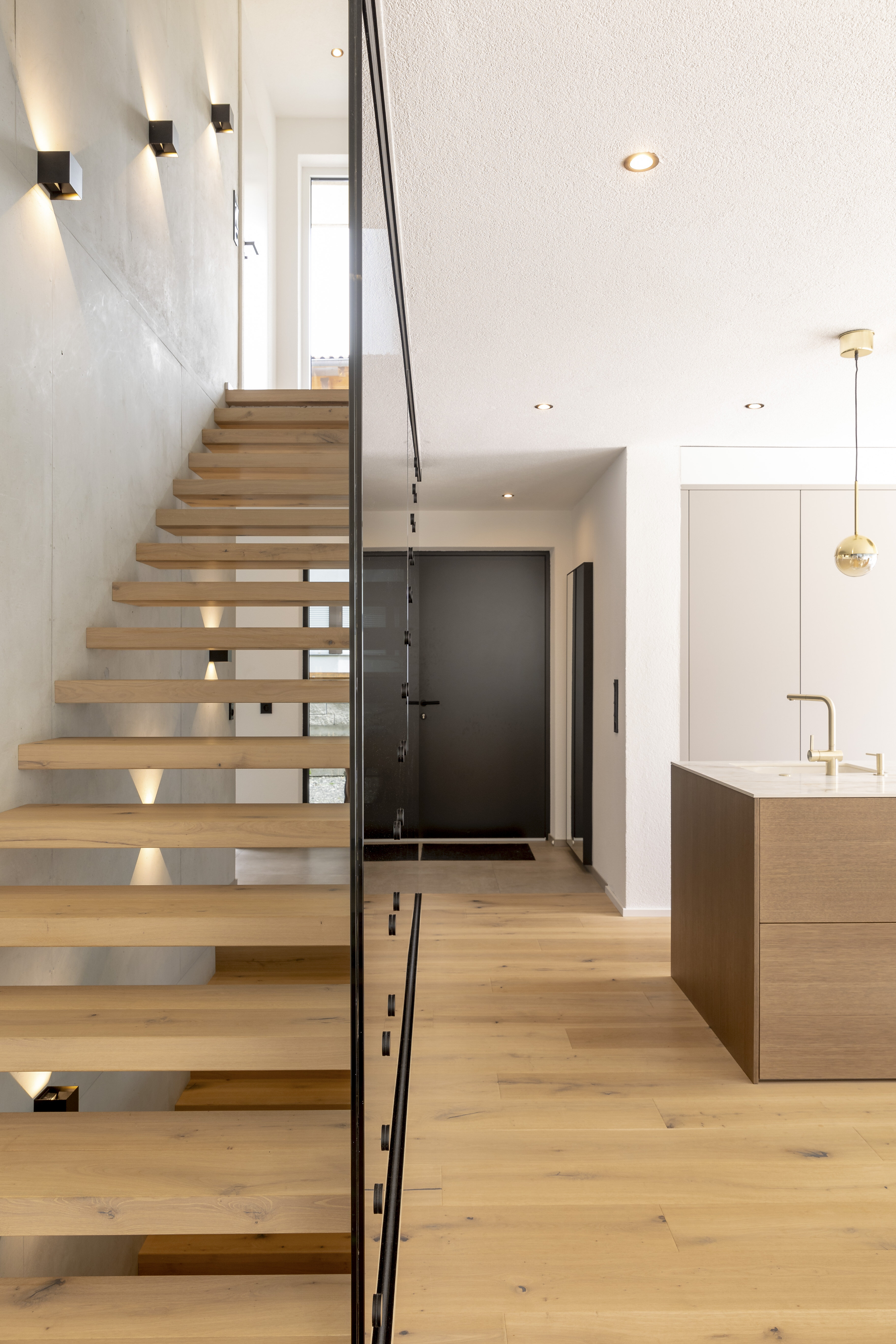 Ein weiteres besonderes Detail ist der handgehobelte, weiß geölte Eichenparkettboden, der sich durch das gesamte Erdgeschoss zieht. Er verleiht dem Haus Wärme und Natürlichkeit. Besonders beeindruckend ist die Sichtbetonwand, die über alle drei Etagen verläuft und einen spannenden Kontrast zu den hellen Möbeln bildet. Diese Kombination aus Beton und Holz unterstreicht den modernen Charakter des Hauses und verleiht ihm eine einzigartige Ausstrahlung.