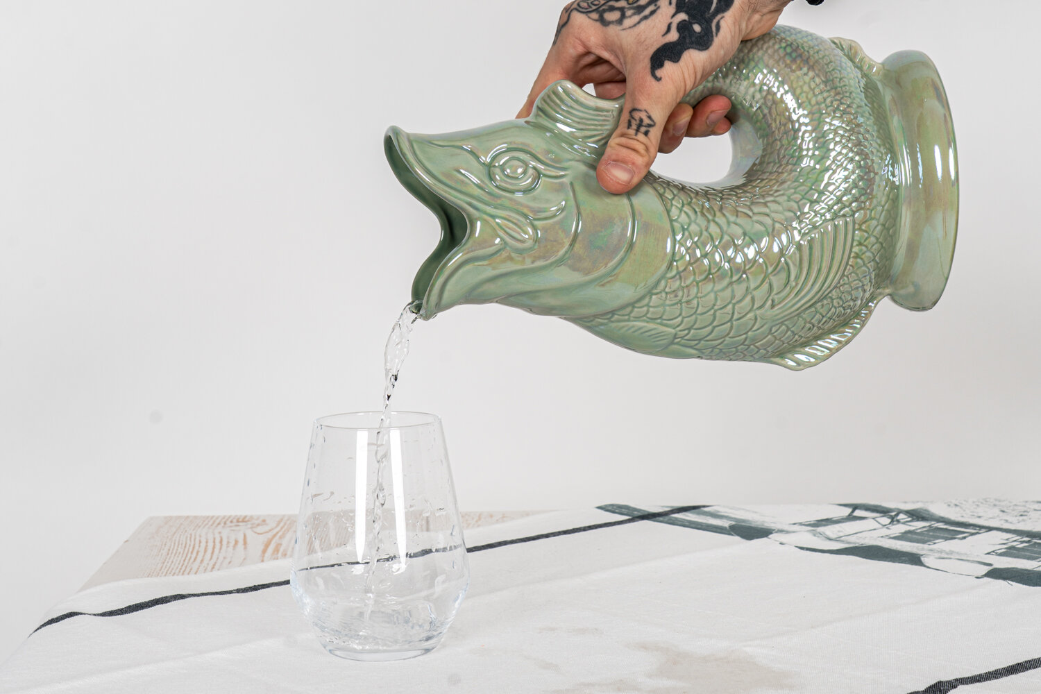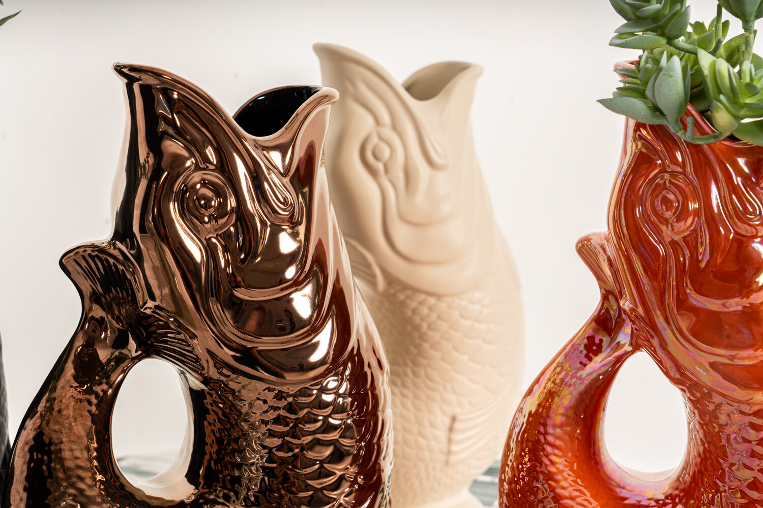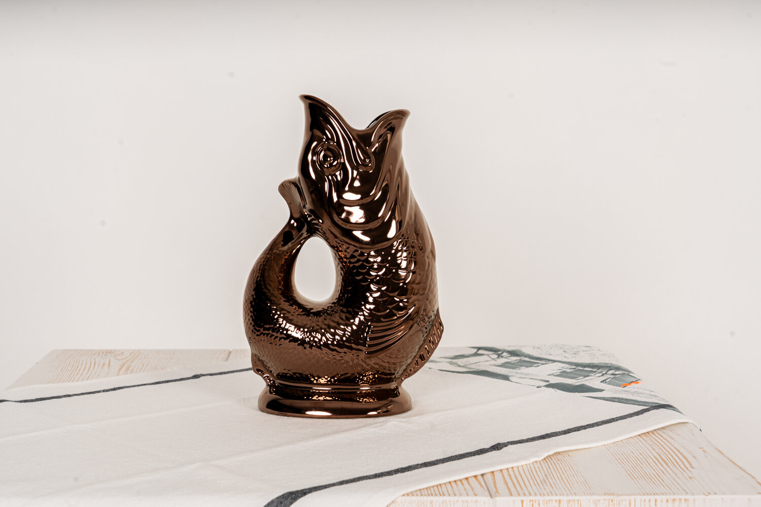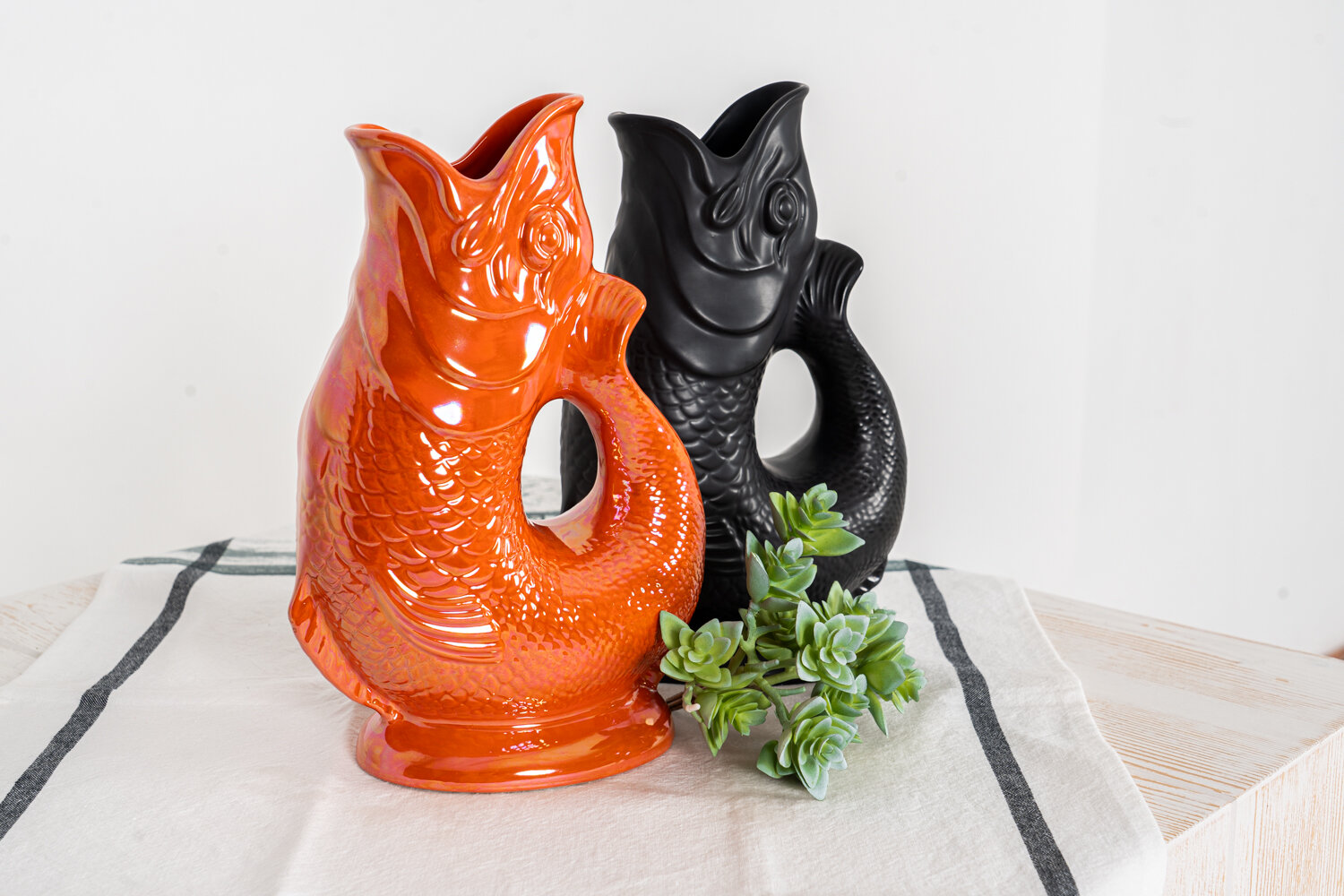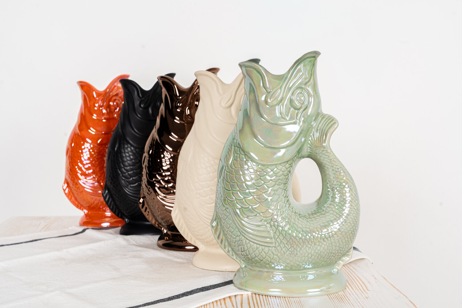 Ein besonderes Highlight sind die originalen Gluckigluck Karaffen, auch bekannt als Gluggle Jugs. Sie begeistern seit über 150 Jahren mit ihrem einzigartigen „Glug“-Geräusch beim Ausgießen und ihrem ikonischen fischförmigen Design.