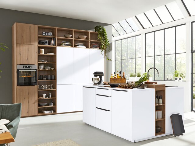 Planungsbeispiel Interliving Einbauküche. Softmatte arcticweiße Lacklaminatfronten mit Akzenten aus Vulkaneiche NB / inkl. NEFF-Geräteset / inkl. Spüle & Armatur / inkl. Lieferung & Montage