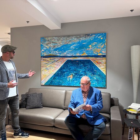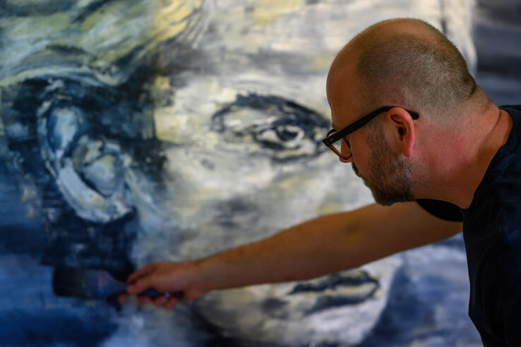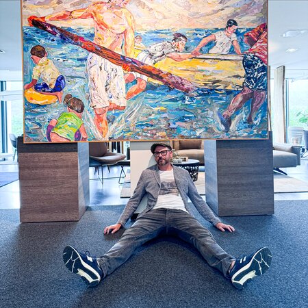 In der Ausstellung „zu Land und Wasser“ zeigt Andreas Dullnig Menschen in deren landschaftlichem Umfeld. Hier setzt sich der Künstler auch mit der „Selfie-Kultur“ kritisch auseinander. Ein wichtiges Thema im Schaffensprozess des Malers ist jedoch der künstlerische Prozess und die damit einhergehenden Entdeckungen neuer Methoden innerhalb der Malerei.